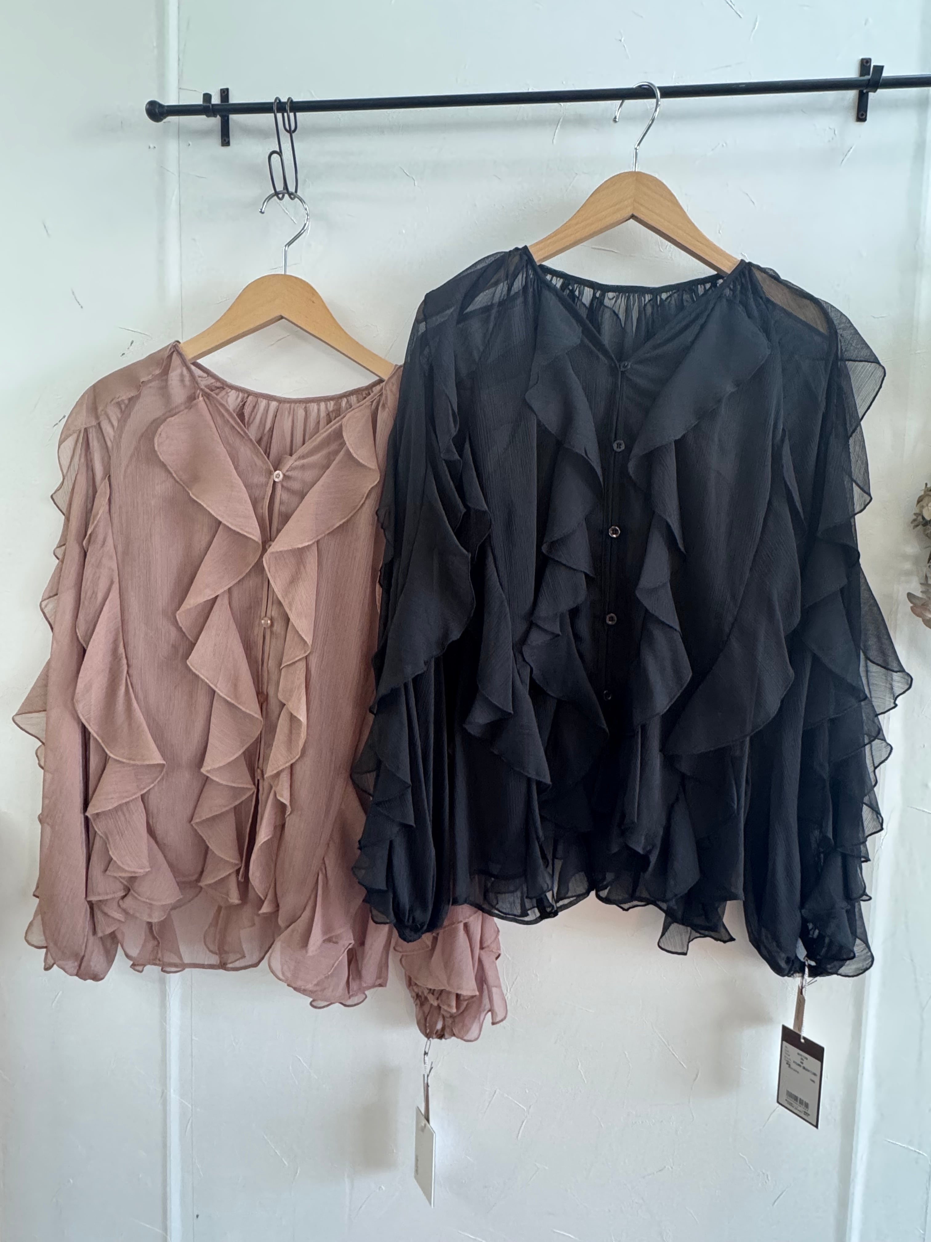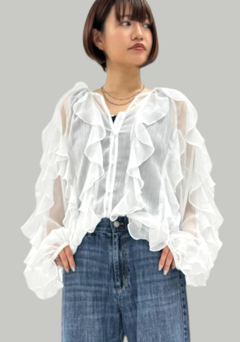 シアー素材とフリルが特徴で着映え効果抜群ブラウス。