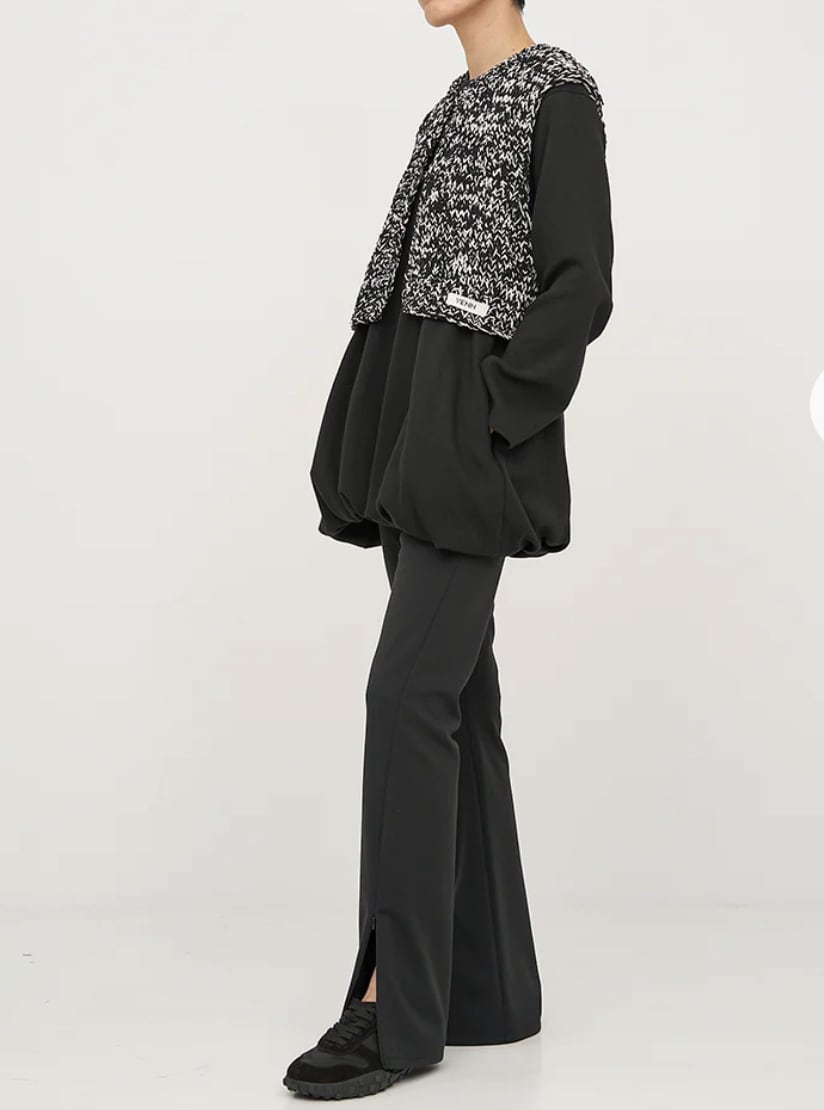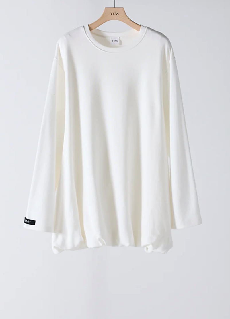 裾のバルーン仕様で作るふくらんだフォルムが特徴で、カジュアルなアイテムに柔らかくフェミニンな雰囲気を与えます。