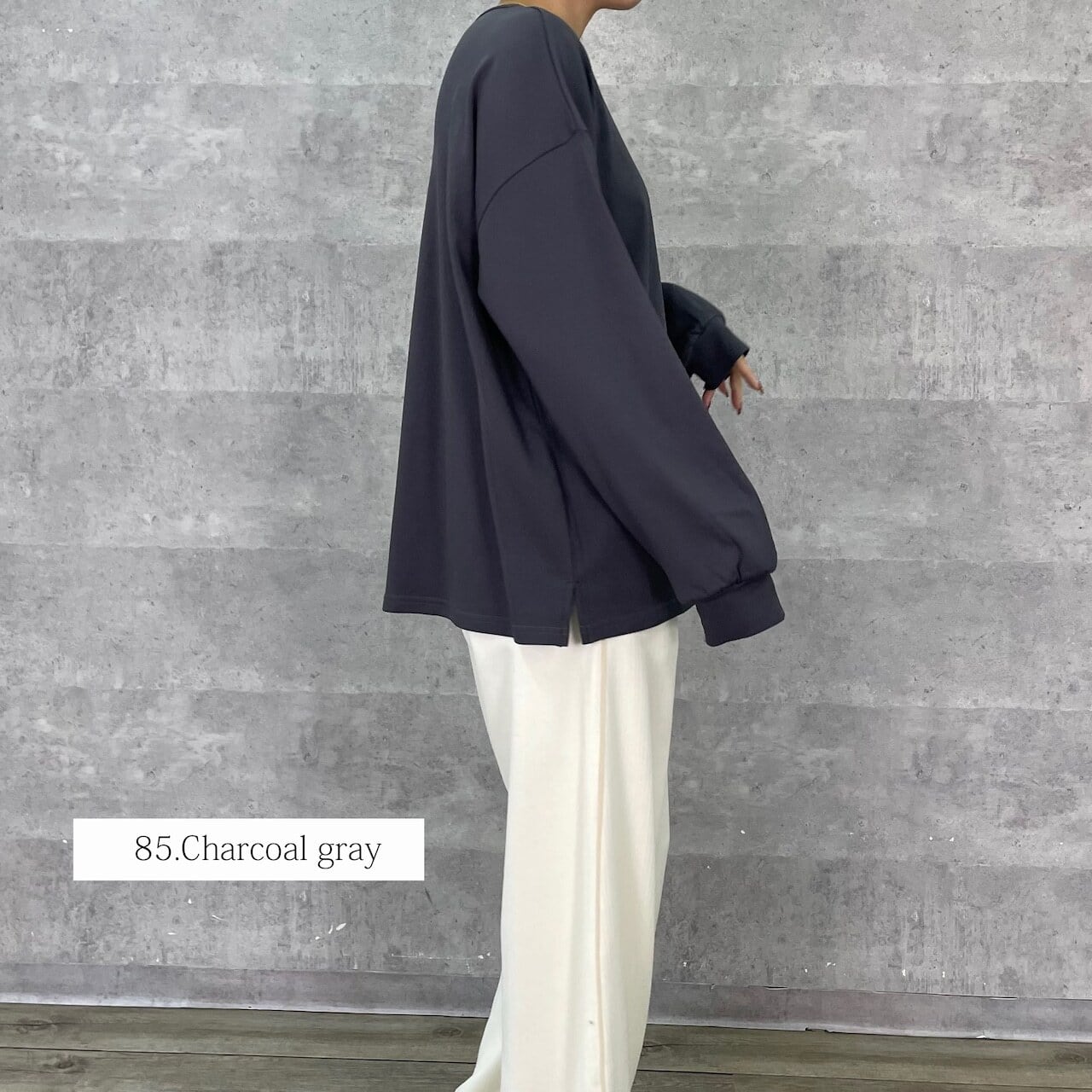 女性が着るとたっぷりとした分量感で体が泳ぐ絶妙なサイズ感が華奢見えします。