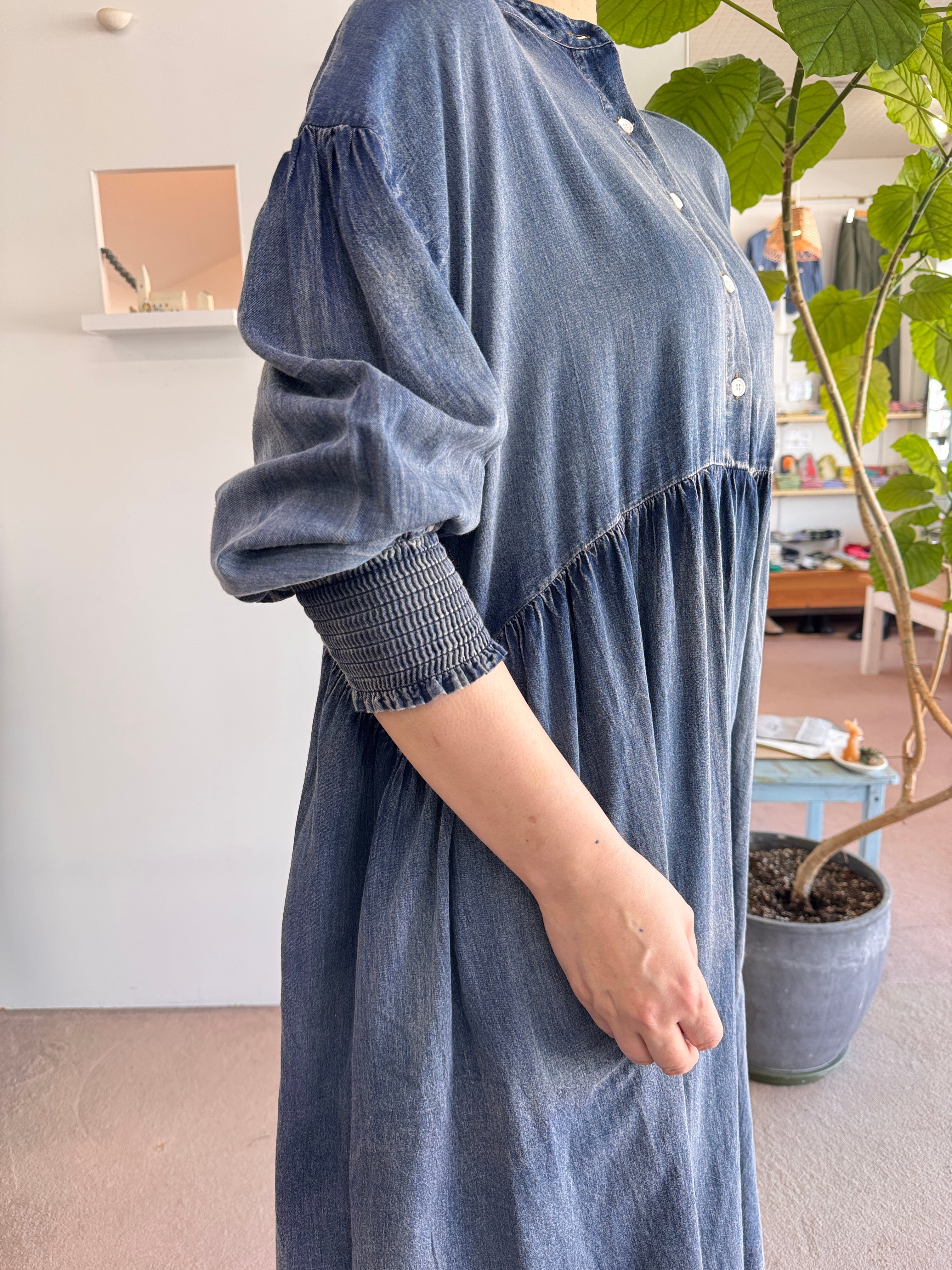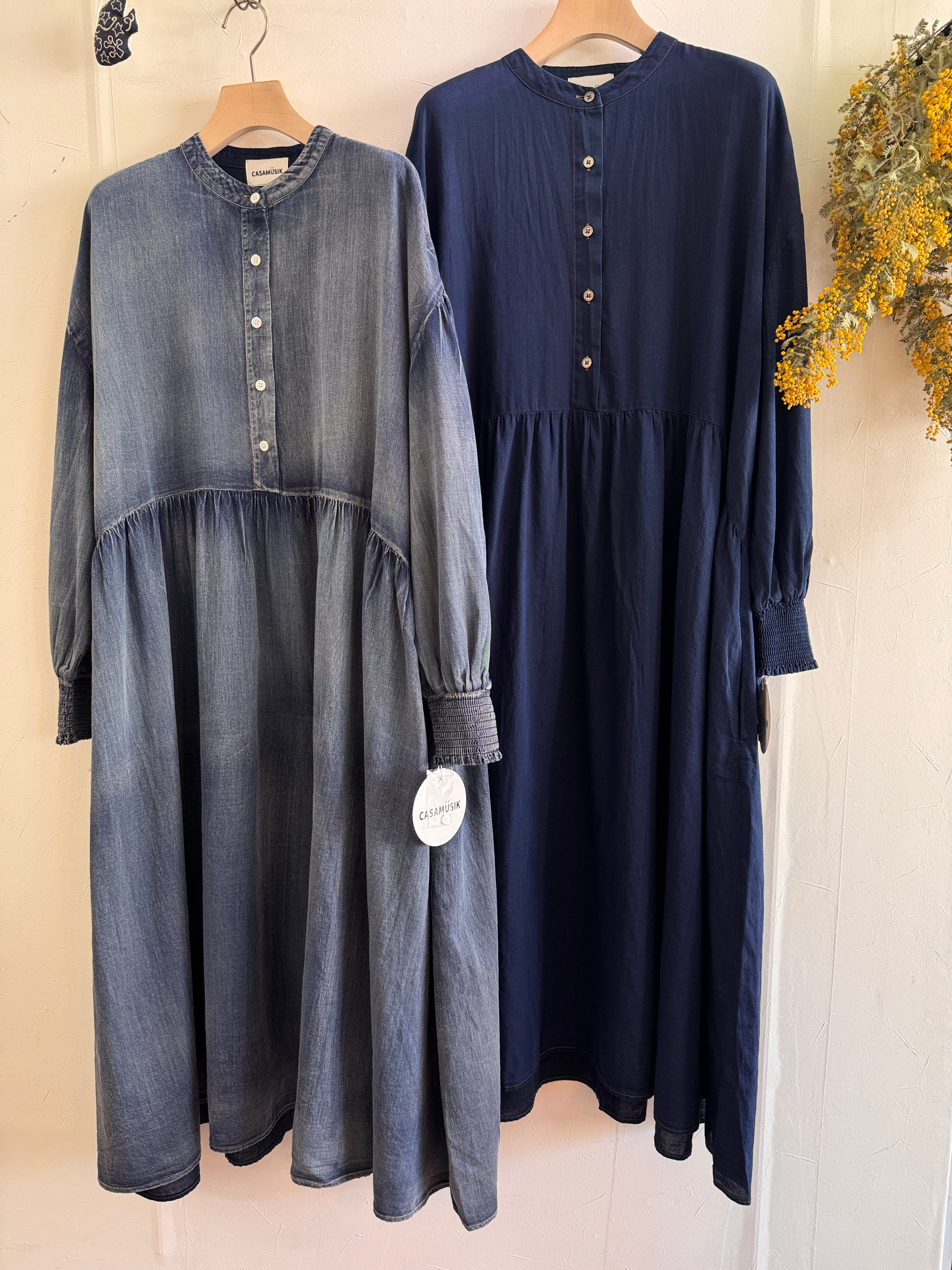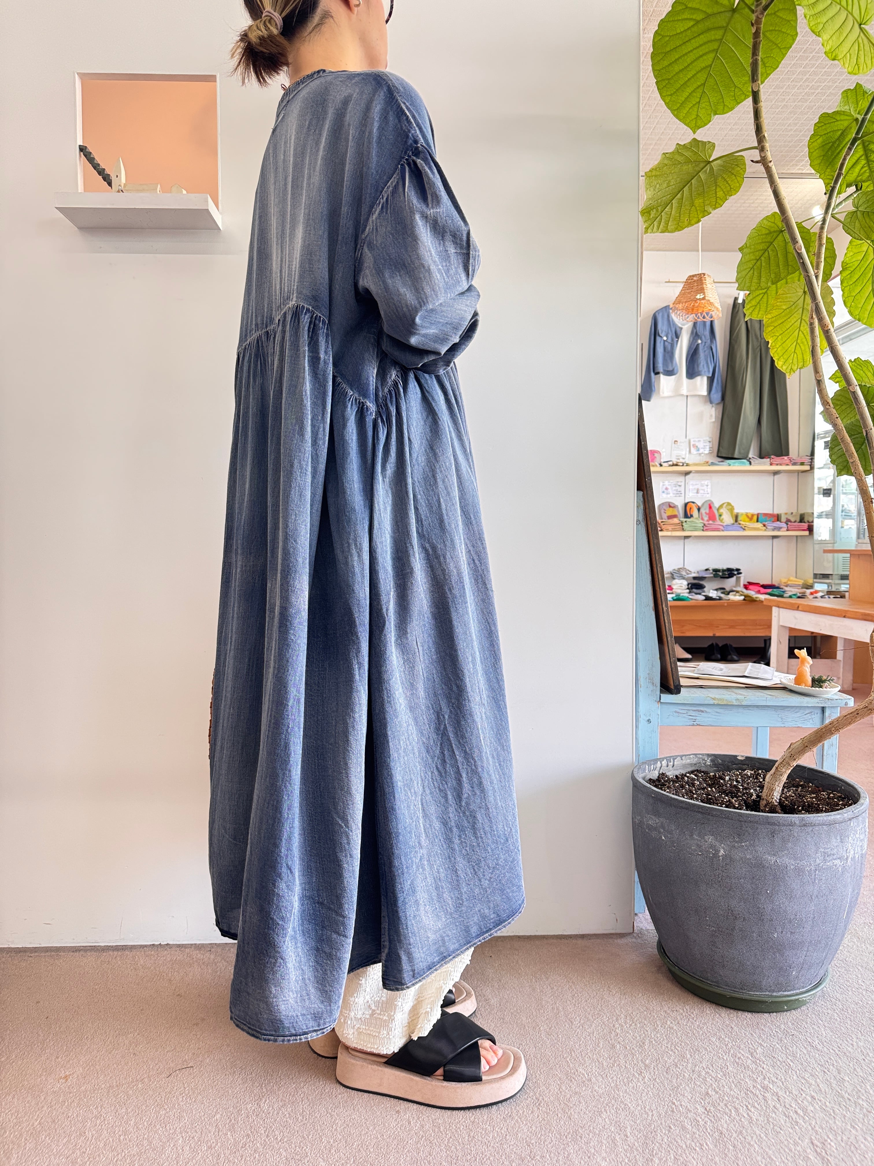 軽やかなシフォンデニムで仕立てたロングワンピース。